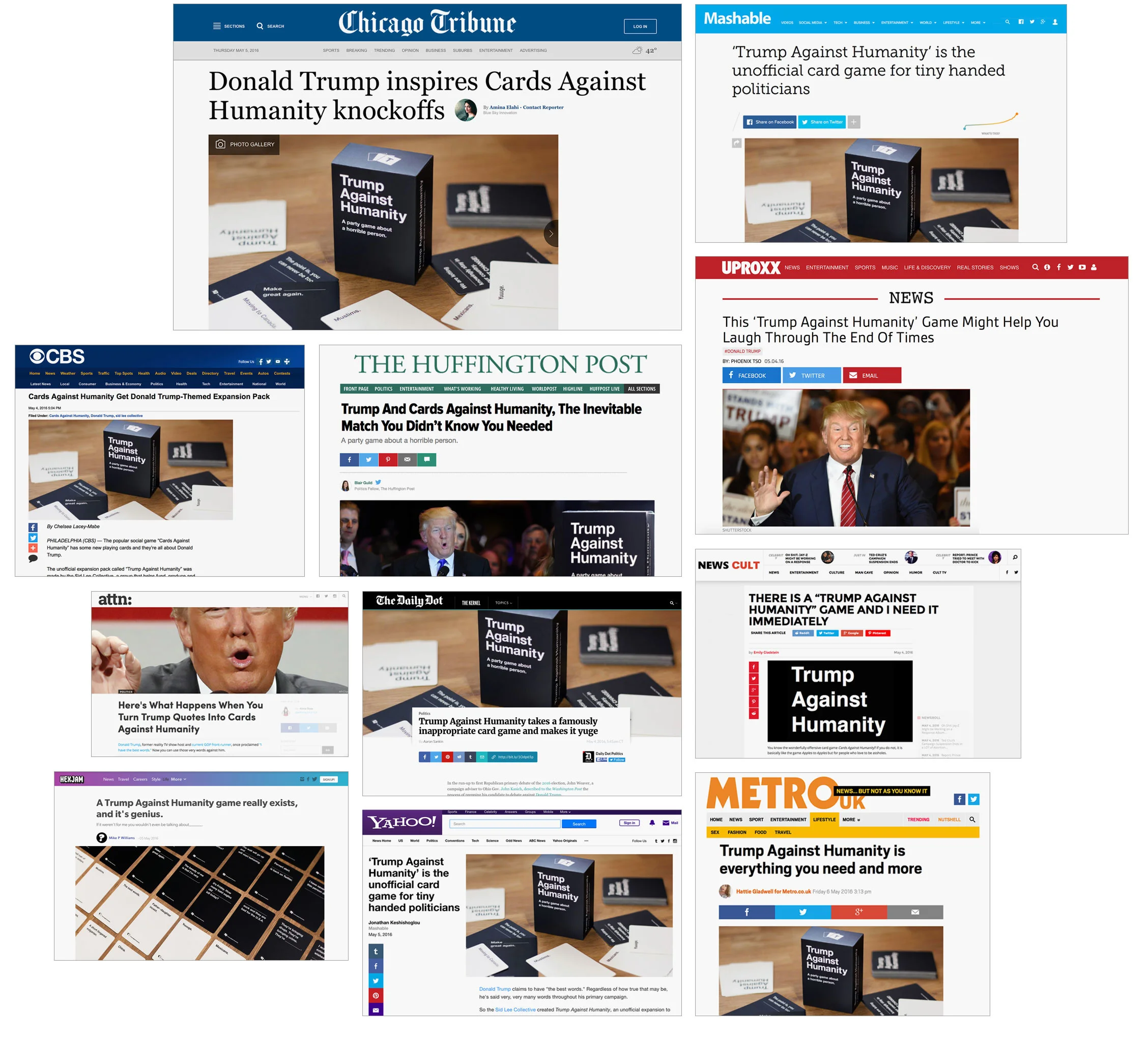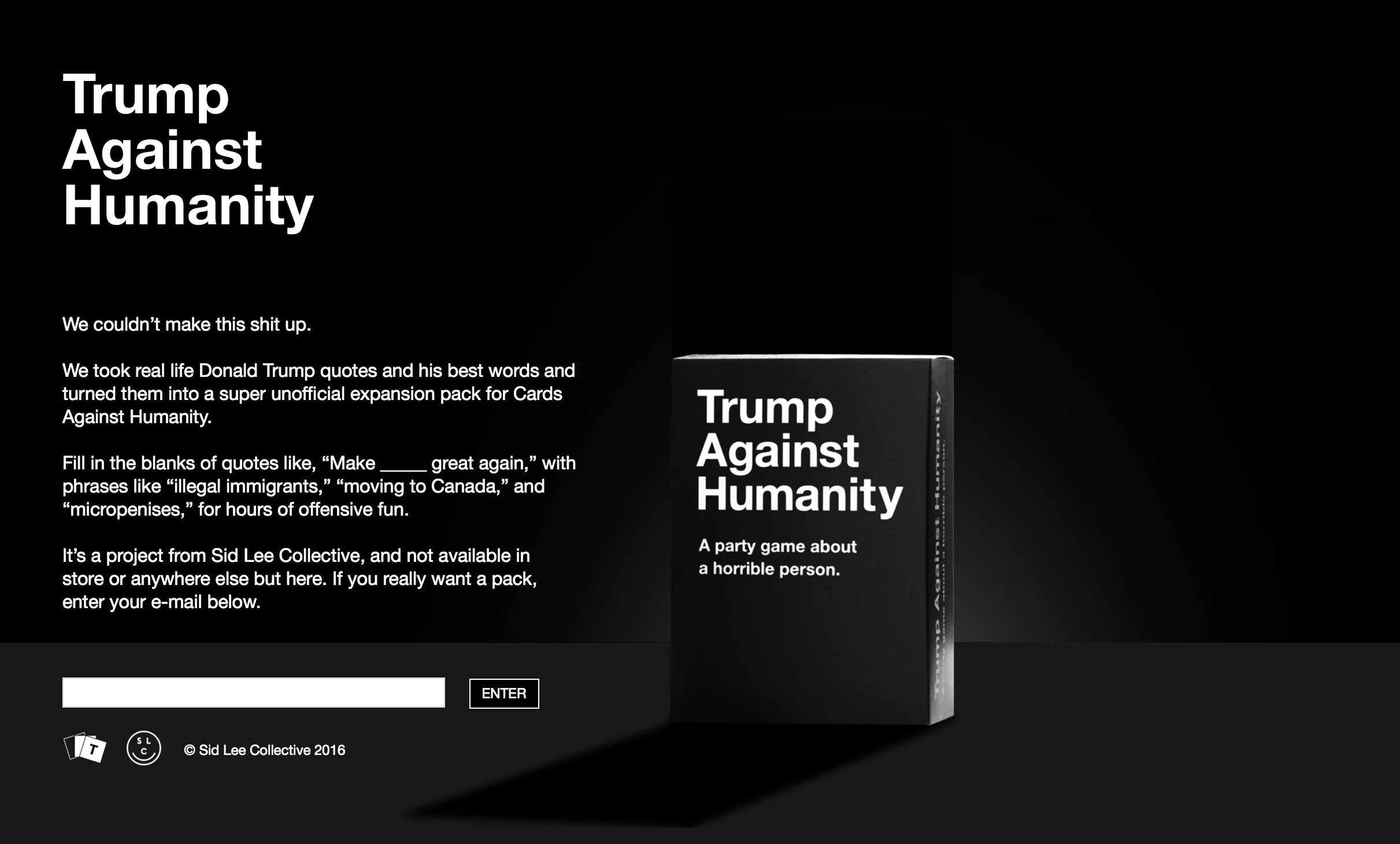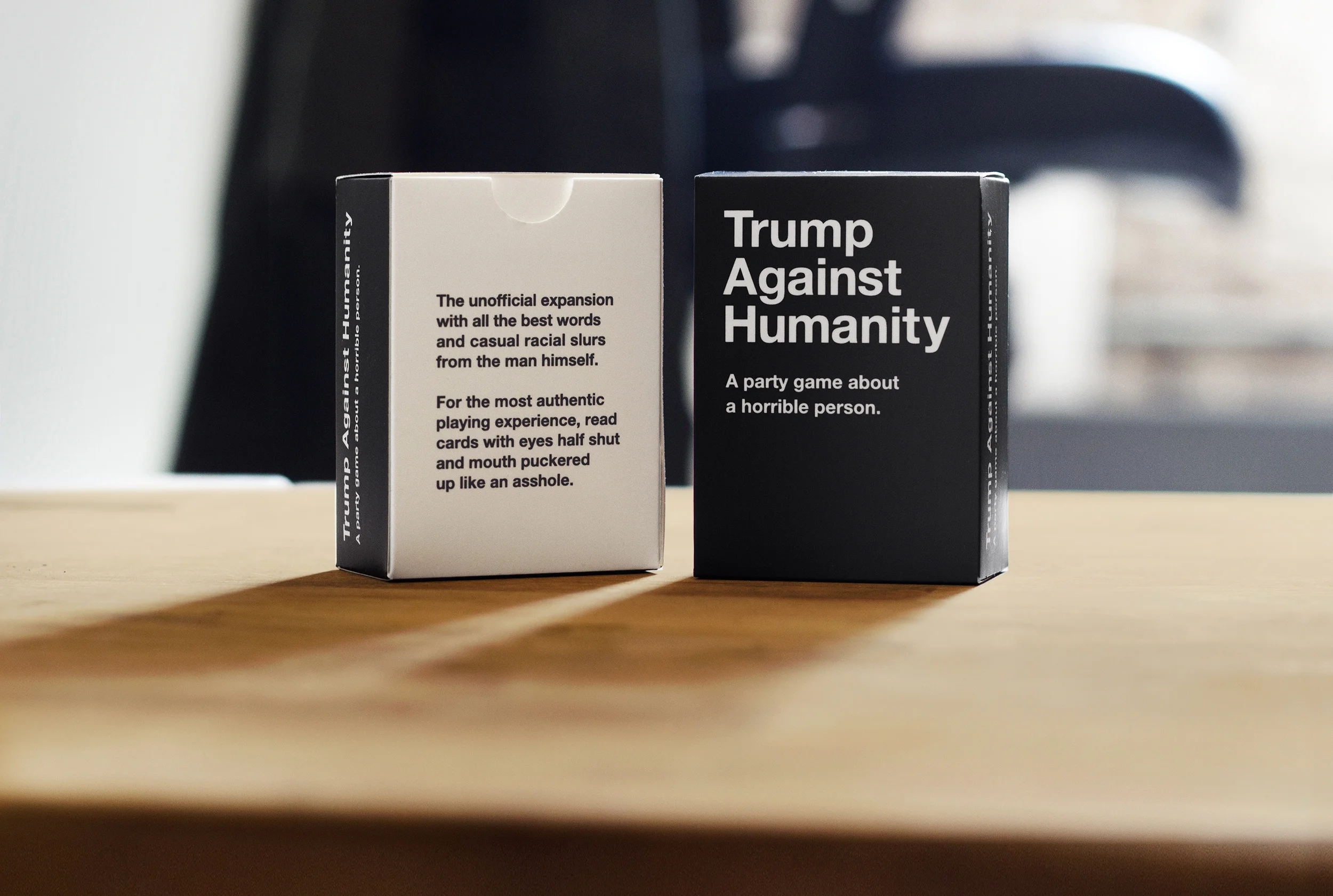 Donald Trump has a thing against humanity. And Cards Against Humanity is a super fun game. This is an expansion pack for that super fun game using quotes and words exclusively said by, or tied to, Donald Trump.